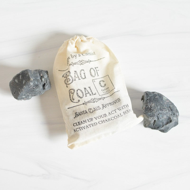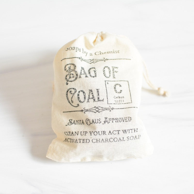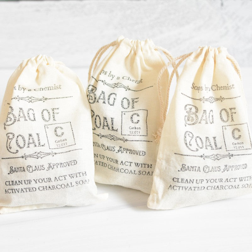 Contents: two (~1.1oz) pieces of coal soap (2.2+ oz total) in a hand stamped canvas bag with cotton drawstrings as pictured.
