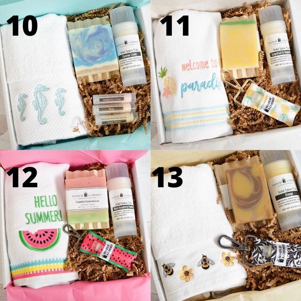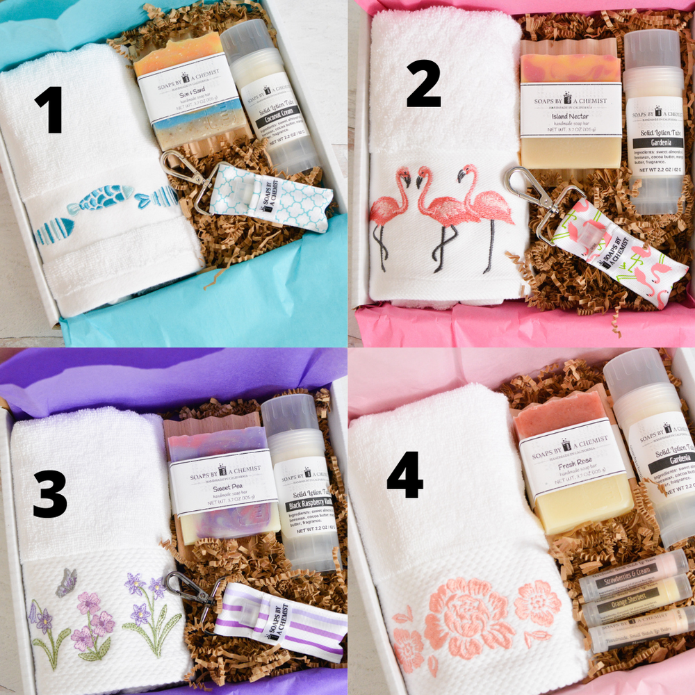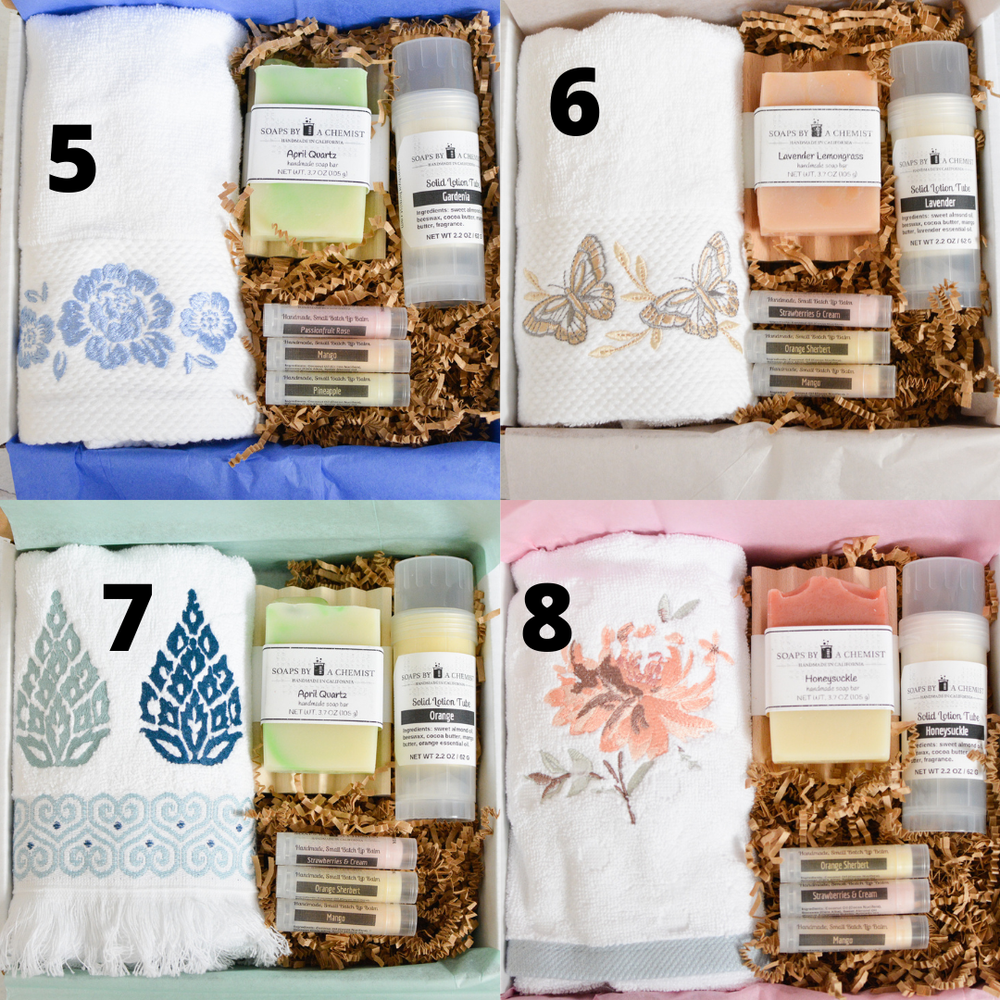 -1 hand towel (as pictured for the chosen set, all other items are subject to availability. Leave a note at checkout if you want to choose your own soap, lotion, lip balms)