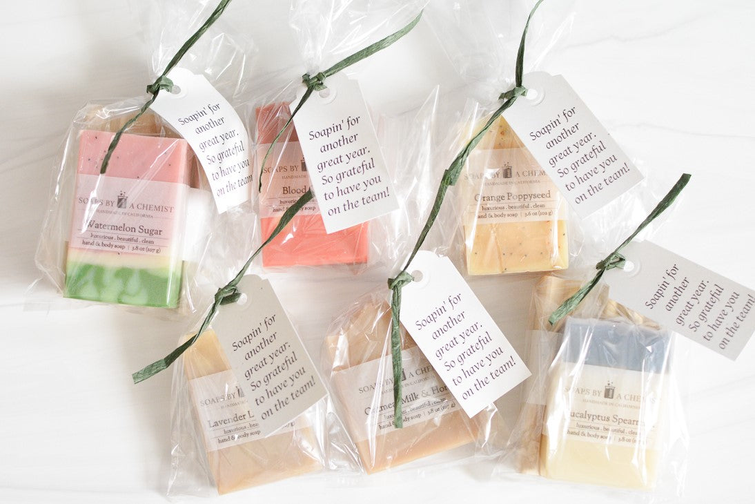 -gift tag with "Soapin' for another great year. So grateful to have you on team!"