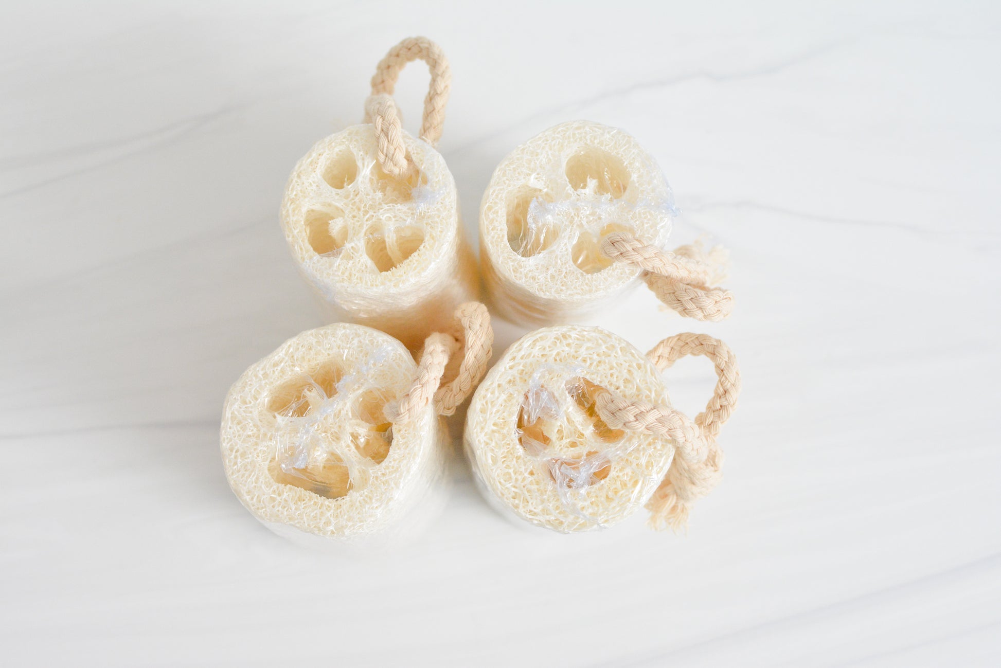 ~4 inch loofah with cotton rope, individually shrink wrapped for cleanliness.