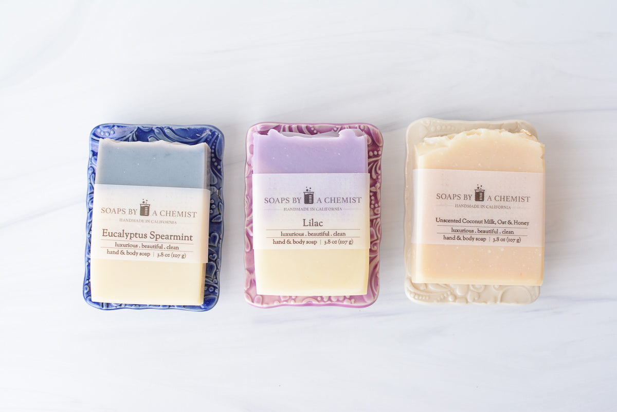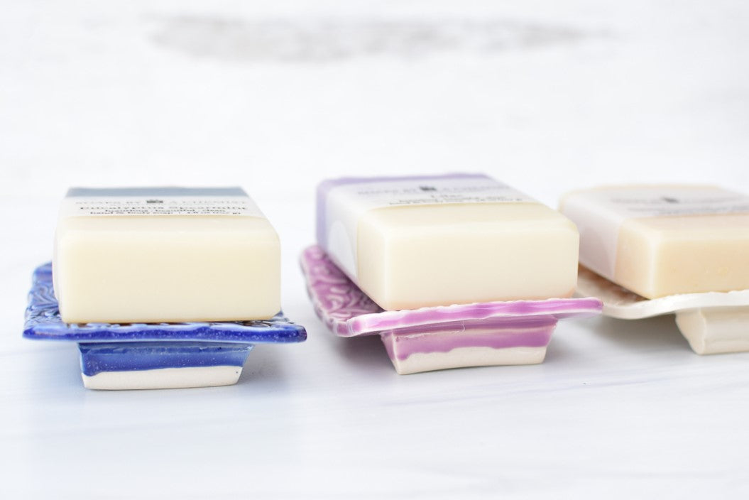 Every soap needs a soap dish. Extend the life of your soap and enhance the beauty of your bathroom. These purple ceramic soap dishes were designed and made in collaboration with a fellow small business, Bleu Dog Beads, in Nevada. I hope you love them as much as I do!