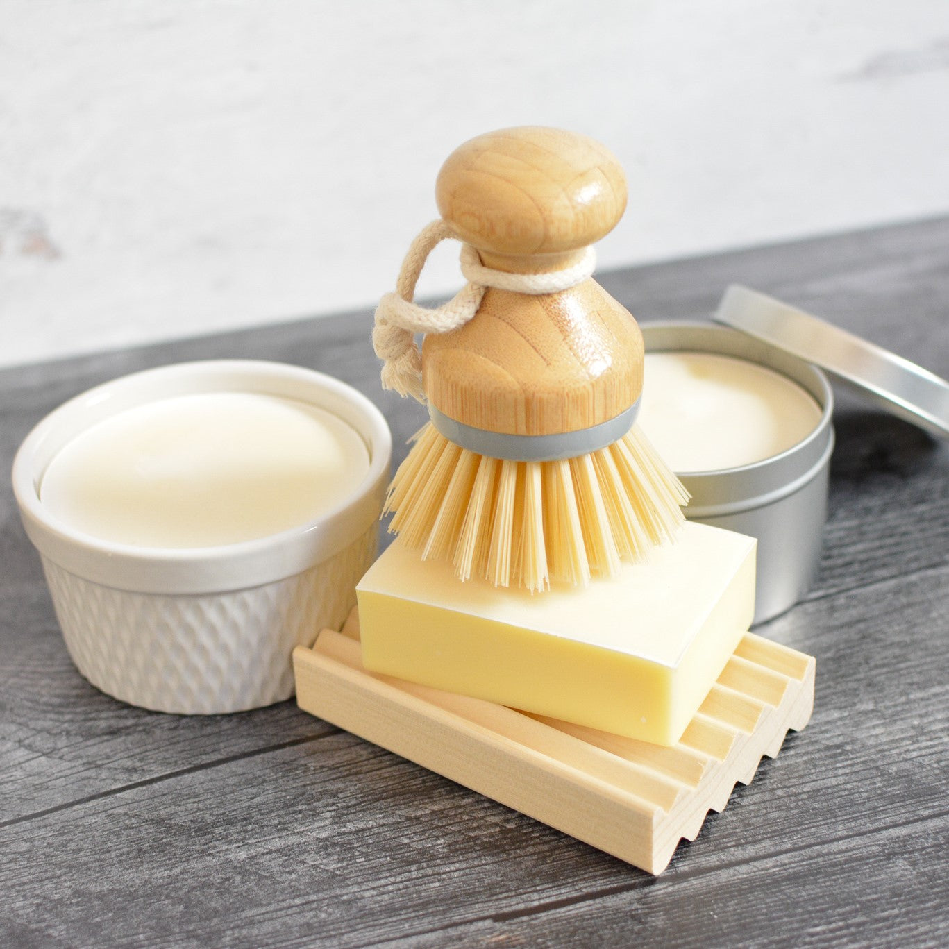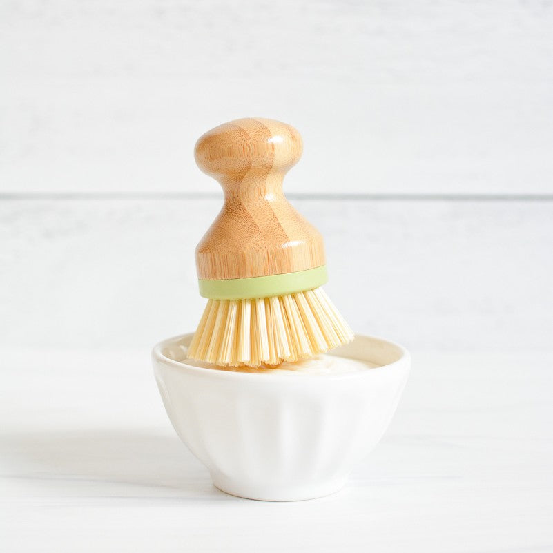 ~Tapered Ceramic Bowl Starter Set w/brush: (1) white ceramic bowl w/ 6oz solid dish soap and (1) bamboo scrub brush (grey or green accent color).
